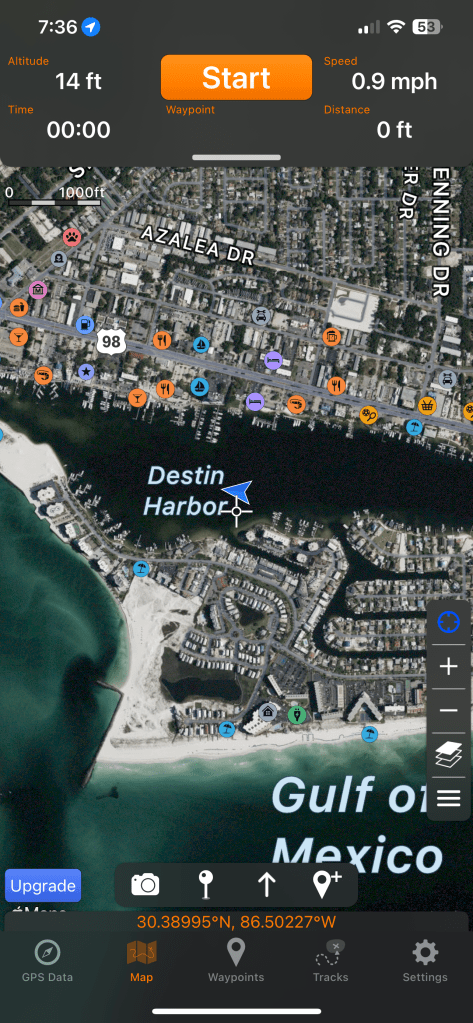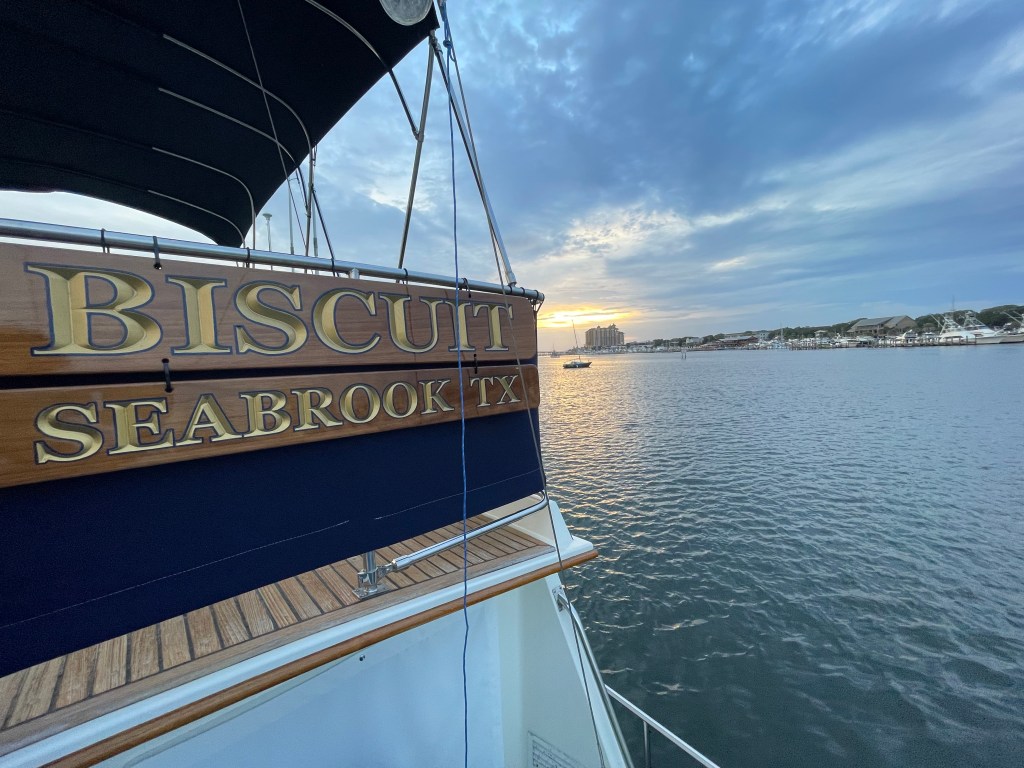 A late departure today due to very wet weather this morning. We are safely anchored in Destin Harbor this evening. Lots of lights and activity around us as the weekend winds down.