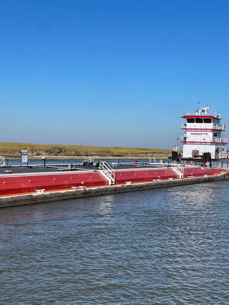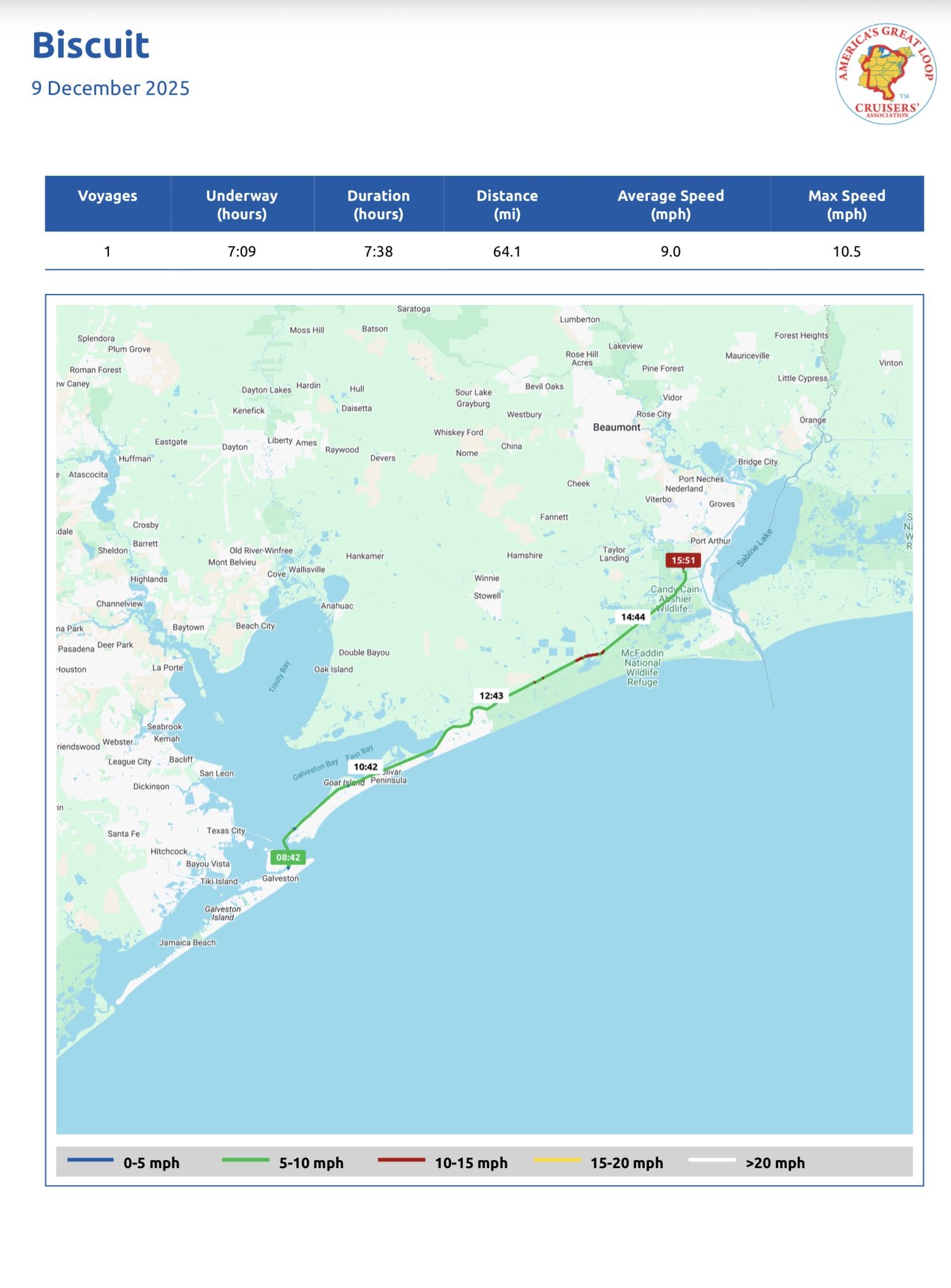 Another great cruising day! A bit chilly and windy, but sunny with good visibility. There are tons of barges in this section of the Gulf Intracoastal Waterway (ICW), so we were able to interact with many captains along the way. We also sighted our first bald eagles!