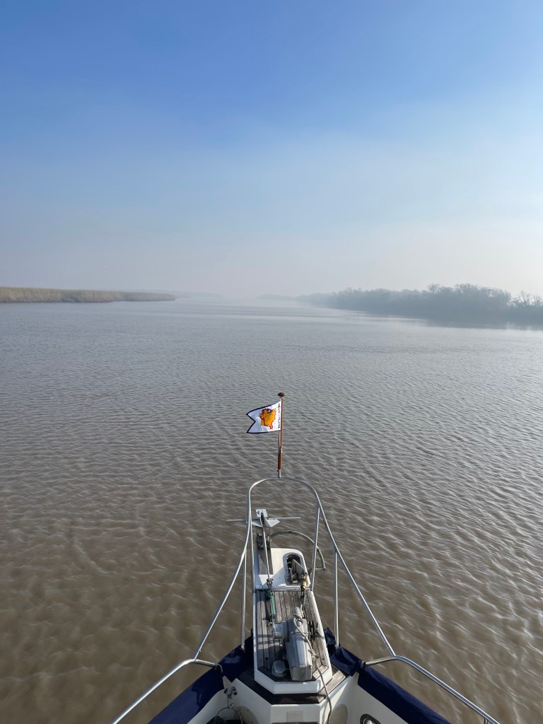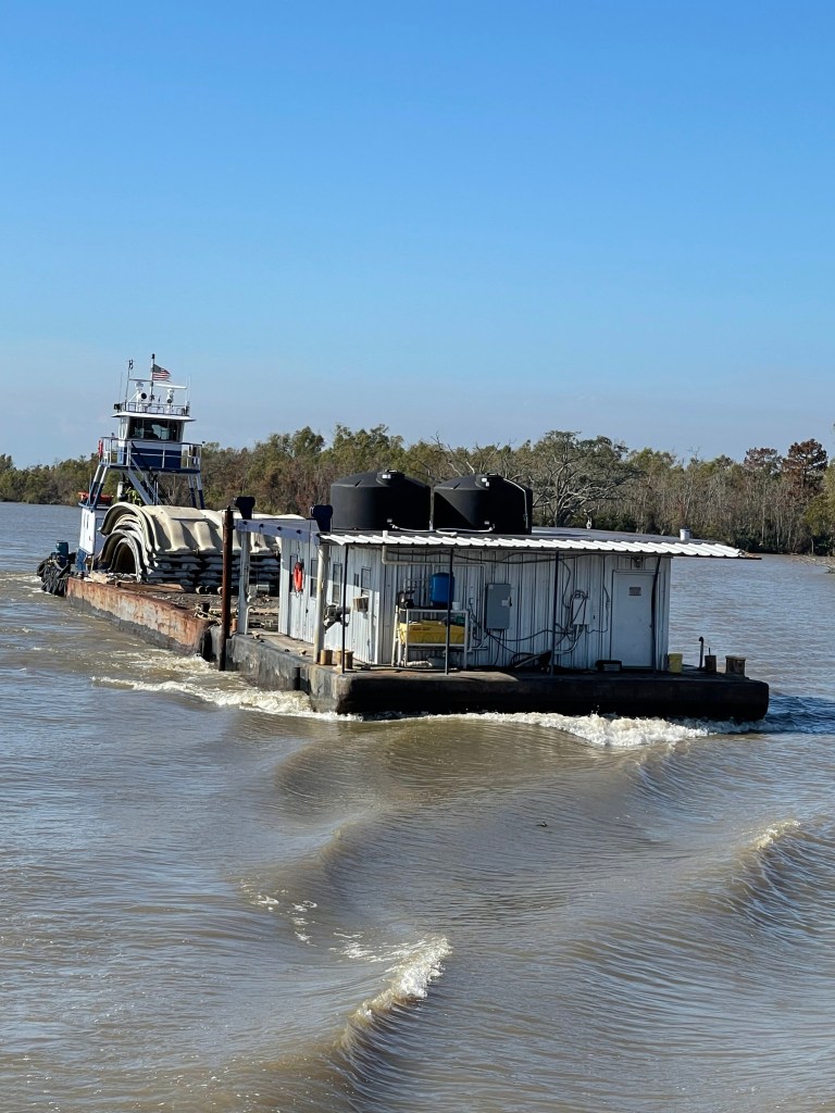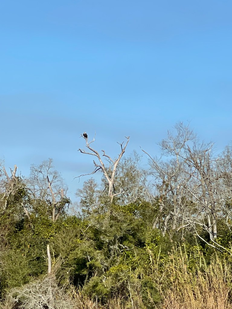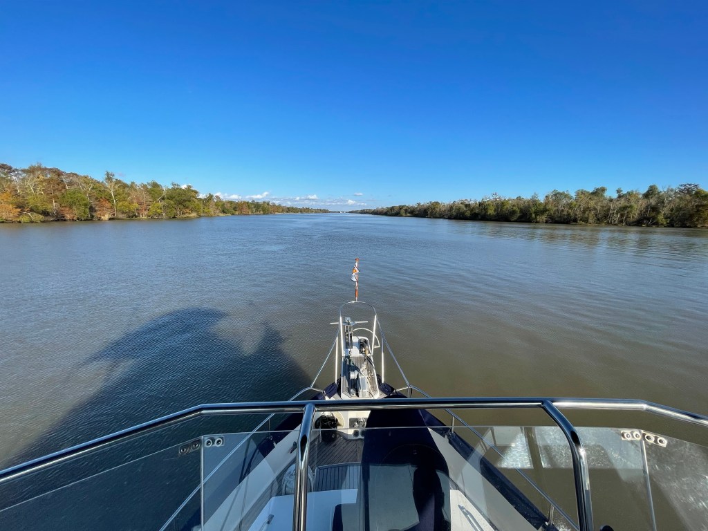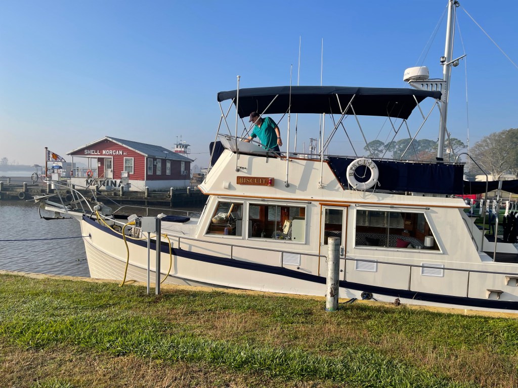 Fog and eagles and bridges, oh my! Another lovely day on the ICW. Very light traffic with exceptional weather (except for the early morning smoke fog, that is). I’m getting Aqua Map dialed in – it’s been extremely helpful as a navigation aid. We saw 8 bald eagles along the way. We are securely tied at the Morgan City Dock for the next couple of days waiting for a strong cold front to blow through. Goodnight from the Biscuit!
