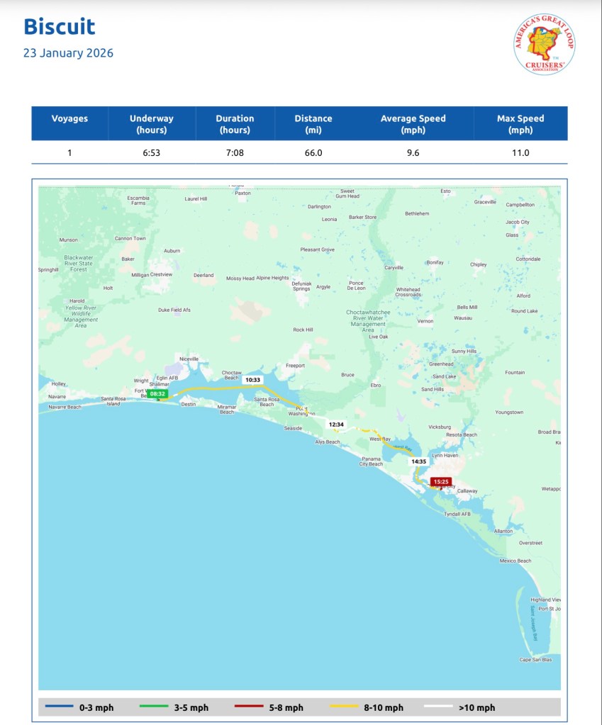 We finally made it to Apalachicola, Florida after 5 long cruising days. We had some “sporty” winds today, but otherwise it was lovely and uneventful. We plan to rest and recharge until we can make a safe Gulf crossing to Clearwater, Florida on the west coast. It will likely be a couple more weeks. The most dangerous thing on a boat is a schedule!