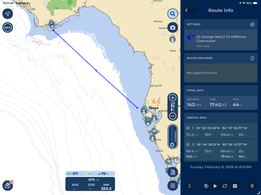 One response to “Day 32 (2/8/26) – Scipio Creek Marina to Clearwater Harbor Marina (Overnight Gulf Crossing)”
